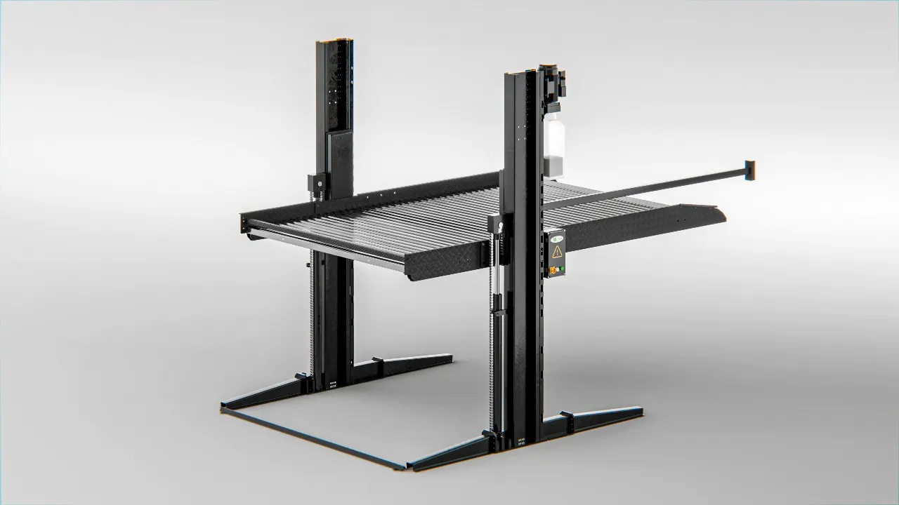 Professional two post parking lift with single-stage dual/single hydraulic cylinders, shared posts for space saving, and EN safety certification. Designed for 2-3 ton vehicles, it is the ideal space-saving solution for residential and commercial parking projects.