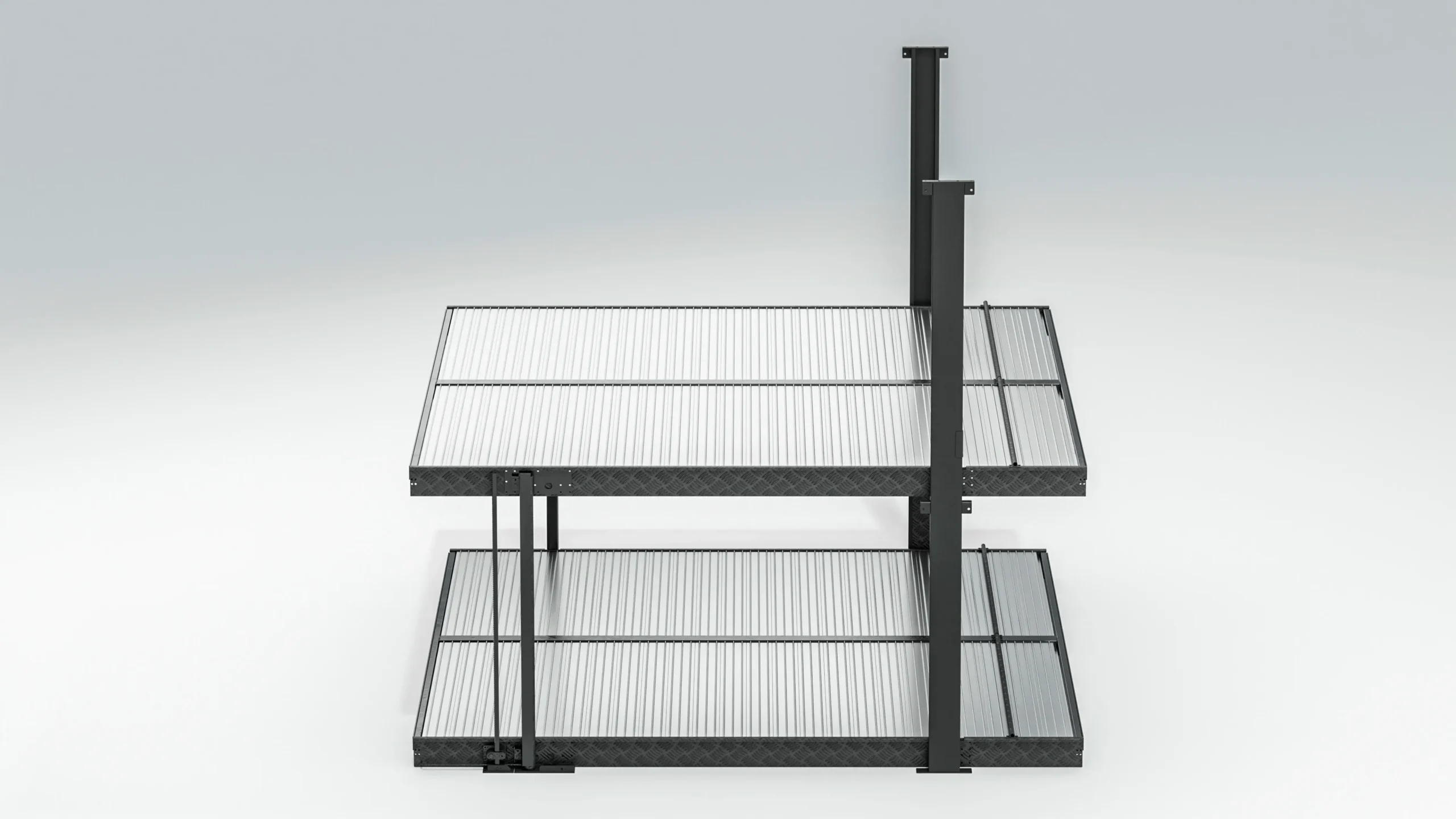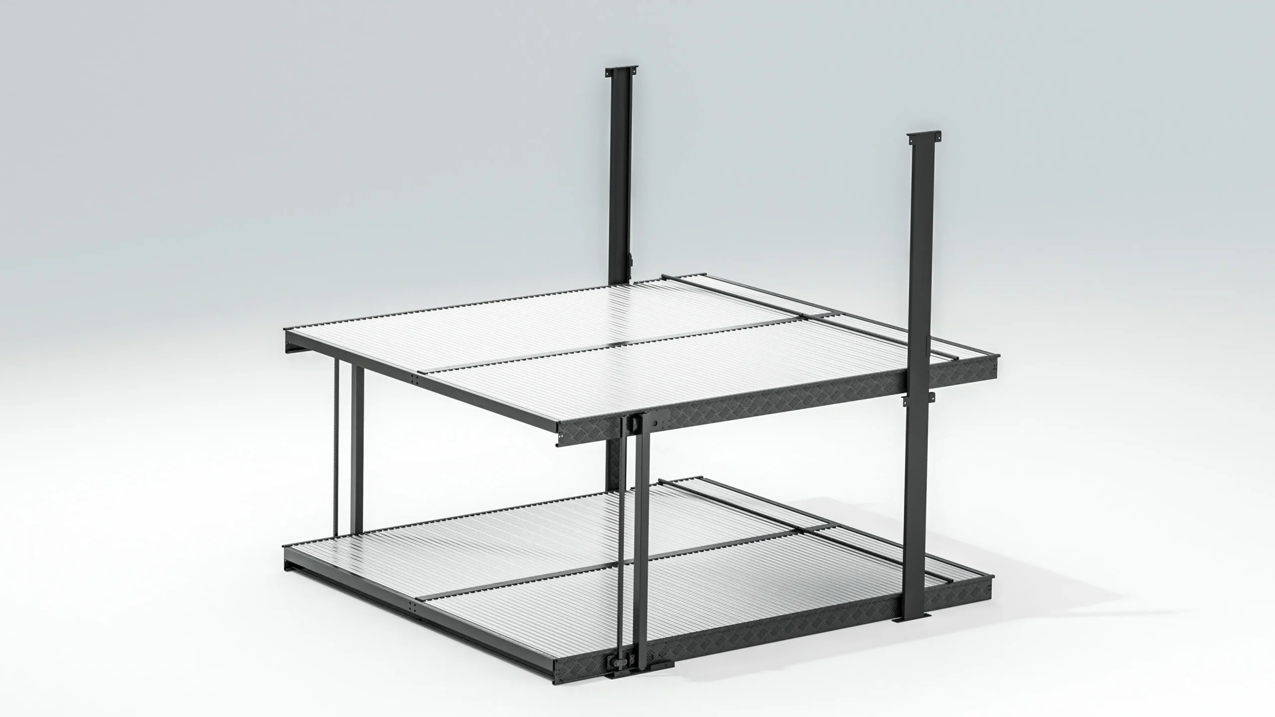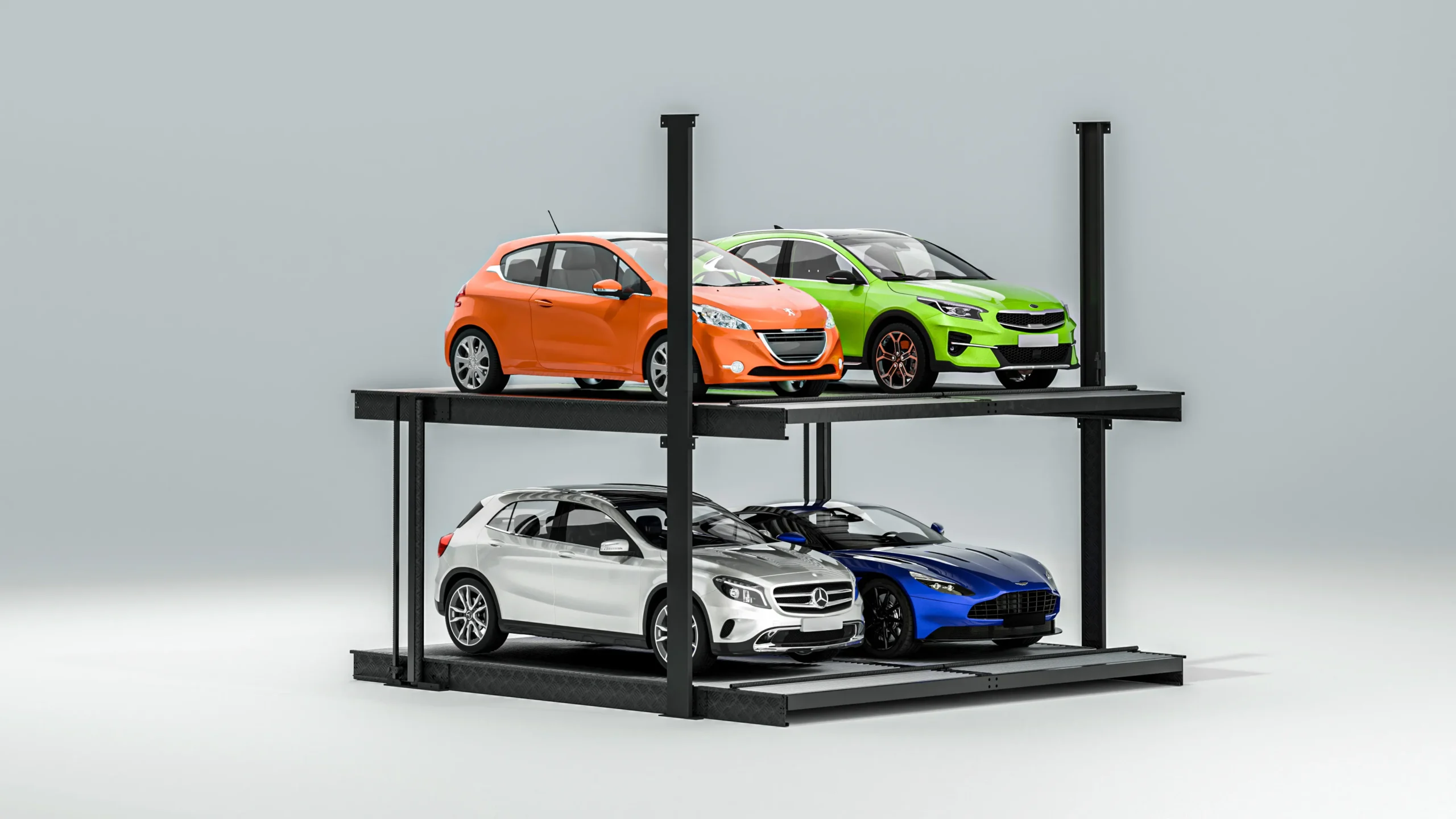Each level can carry 2 cars side-by-side, doubling parking capacity in the same footprint.